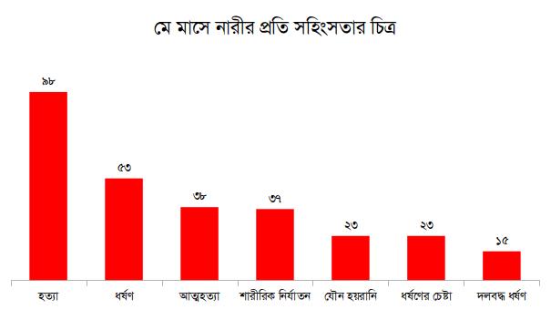 এছাড়া মে মাসে ৩৮ জন নারীর আত্মহত্যার ঘটনা ঘটেছে। এদের মধ্যে ১০টি ঘটনা ঢাকায়; বরিশাল, চট্টগ্রাম, কক্সবাজার, ফরিদপুর, নাটোর ও সুনামগঞ্জ জেলায় ২টি করে আত্মহত্যার ঘটনা ঘটেছে। মে মাসে শারীরিক সহিংসতার মোট ৩৭টি ঘটনা প্রকাশ হয়েছে। এগুলো ঘটেছে দেশের ১৯টি জেলায়। বগুড়া, চট্টগ্রাম ও দিনাজপুর জেলায় সর্বোচ্চ ৪টি করে ঘটনা লিপিবদ্ধ হয়েছে। ঢাকা ও লক্ষ্মীপুর জেলায় ৩টি করে শারীরিক সহিংসতার ঘটনা দেখা গেছে।