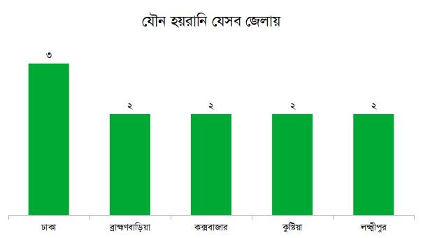 চার্টে উল্লেখিত জেলার বাইরে বাগেরহাট, চট্টগ্রাম, গাজীপুরসহ ১০টি জেলায় ২টি করে ঘটনা পাওয়া গেছে। দেশের ৩৯টি জেলায় কমপক্ষে ১টি যৌন সহিংসতার ঘটনা রেকর্ড করা হয়েছে।